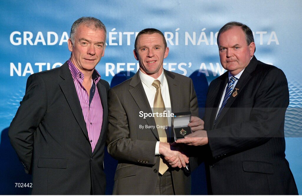 24 November 2012; Referee Michael Duffy, from Sligo, is presented with his All-Ireland Inter-Provincial Football Chamionship referees' medal by Uachtarán Chumann Lúthchleas Gael Liam Ó Néill, right, and Chairman of the National Referees Committee, Pat McEnaney. 2012 National Referees' Awards Banquet, Croke Park, Dublin. Picture credit: Barry Cregg / SPORTSFILE