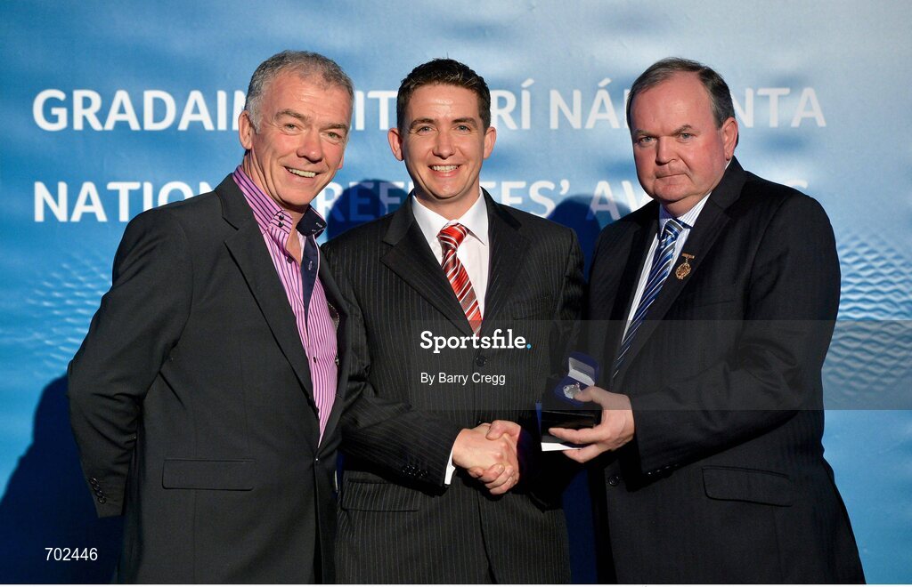 24 November 2012; Referee Colm Lyons, from Cork, is presented with his All-Ireland Minor Hurling Chamionship, Allianz Huling League Division 2A & Inter-Provinical Hurling Chamionship referees' medal by Uachtarán Chumann Lúthchleas Gael Liam Ó Néill, right, and Chairman of the National Referees Committee, Pat McEnaney. 2012 National Referees' Awards Banquet, Croke Park, Dublin. Picture credit: Barry Cregg / SPORTSFILE