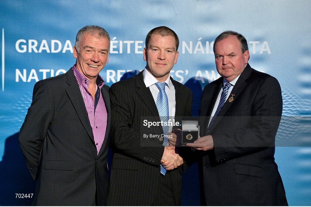24 November 2012; Referee Shane Hourigan, from Limerick, is presented with his All-Ireland Minor B Hurling Chamionship referees' medal by Uachtarán Chumann Lúthchleas Gael Liam Ó Néill, right, and Chairman of the National Referees Committee, Pat McEnaney. 2012 National Referees' Awards Banquet, Croke Park, Dublin. Picture credit: Barry Cregg / SPORTSFILE