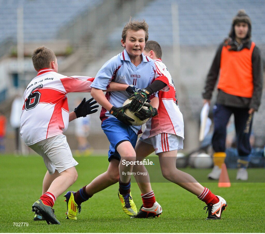 26 November 2012; Liam Mac Eachráin, Scoil Mobhi Glasanaíon, in action against Ryan Nevin, left, and Adam Lambe, Scoil Lorcáin Baile Pámair. Allianz Cumann na mBunscol Finals, Scoil Lorcáin Baile Pámair v Scoil Mobhi Glasanaíon, Croke Park, Dublin. Picture credit: Barry Cregg / SPORTSFILE