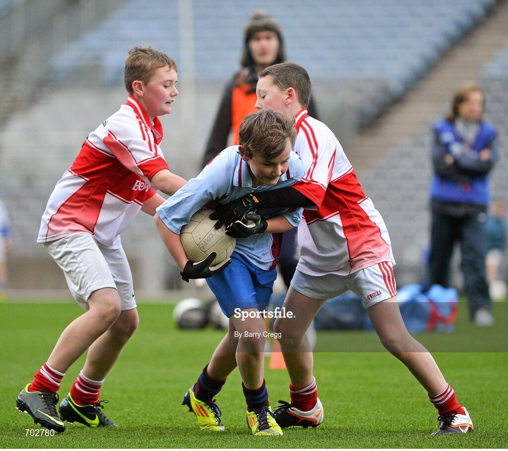 26 November 2012; Liam Mac Eachráin, Scoil Mobhi Glasanaíon, in action against Ryan Nevin, left, and Adam Lambe, Scoil Lorcáin Baile Pámair. Allianz Cumann na mBunscol Finals, Scoil Lorcáin Baile Pámair v Scoil Mobhi Glasanaíon, Croke Park, Dublin. Picture credit: Barry Cregg / SPORTSFILE