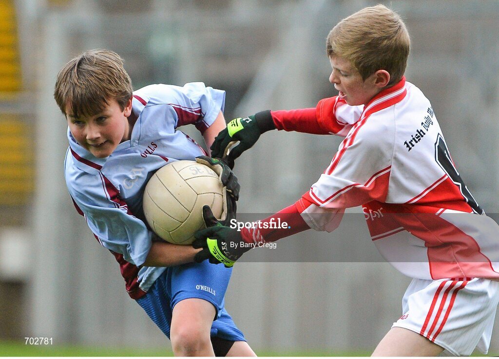 26 November 2012; Liam Mac Eachráin, Scoil Mobhi Glasanaíon, in action against Eoin Massey, Scoil Lorcáin Baile Pámair. Allianz Cumann na mBunscol Finals, Scoil Lorcáin Baile Pámair v Scoil Mobhi Glasanaíon, Croke Park, Dublin. Picture credit: Barry Cregg / SPORTSFILE