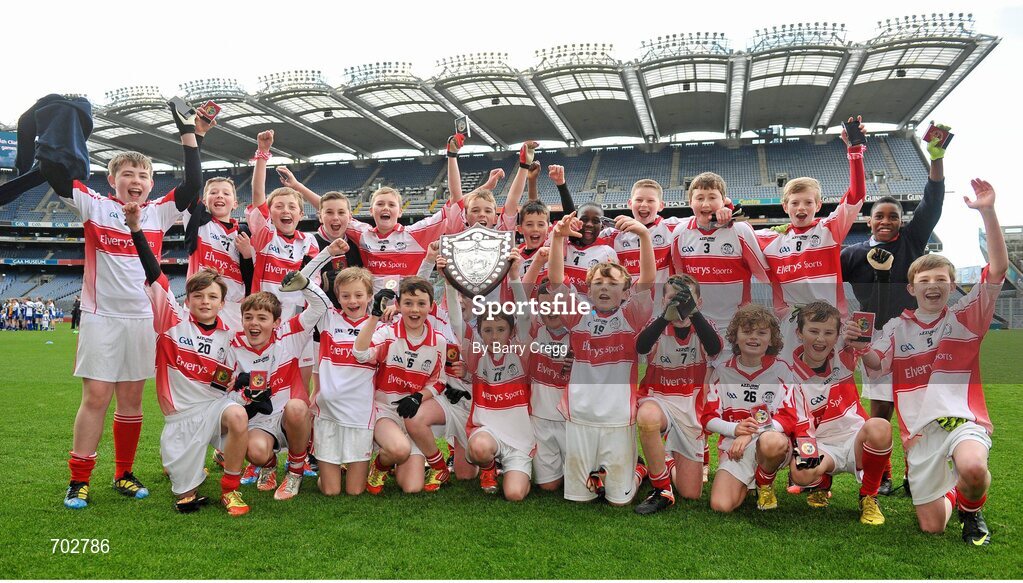 26 November 2012; Scoil Lorcáin Baile Pámair captain Evan Walshe lifts the Sciath Chumann na nGael shield alongside his team-mates. Allianz Cumann na mBunscol Finals, Scoil Lorcáin Baile Pámair v Scoil Mobhi Glasanaíon, Hill End, Croke Park, Dublin. Picture credit: Barry Cregg / SPORTSFILE
