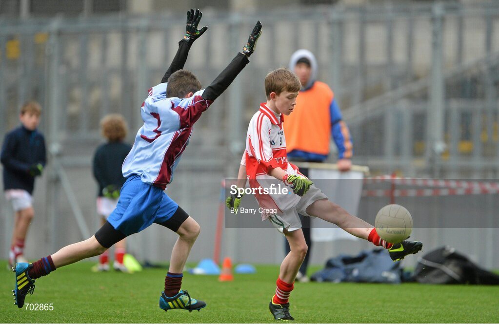 26 November 2012; Billie Keogh, Scoil Lorcáin Baile Pámair, in action against Seán Ó Súilleabhain, Scoil Mobhi Glasanaíon. Allianz Cumann na mBunscol Finals, Scoil Lorcáin Baile Pámair v Scoil Mobhi Glasanaíon, Croke Park, Dublin. Picture credit: Barry Cregg / SPORTSFILE