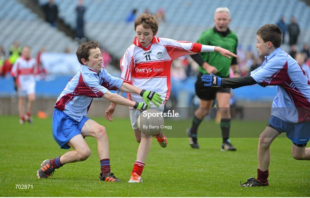 26 November 2012; Evan Walshe, Scoil Lorcáin Baile Pámair, has his shot on goal blocked down by Darach Mac Giolla Bhríde, left, and Fionn Mac Lochlainn Mac Gráinne, Scoil Mobhi Glasanaíon. Allianz Cumann na mBunscol Finals, Scoil Lorcáin Baile Pámair v Scoil Mobhi Glasanaíon, Croke Park, Dublin. Picture credit: Barry Cregg / SPORTSFILE