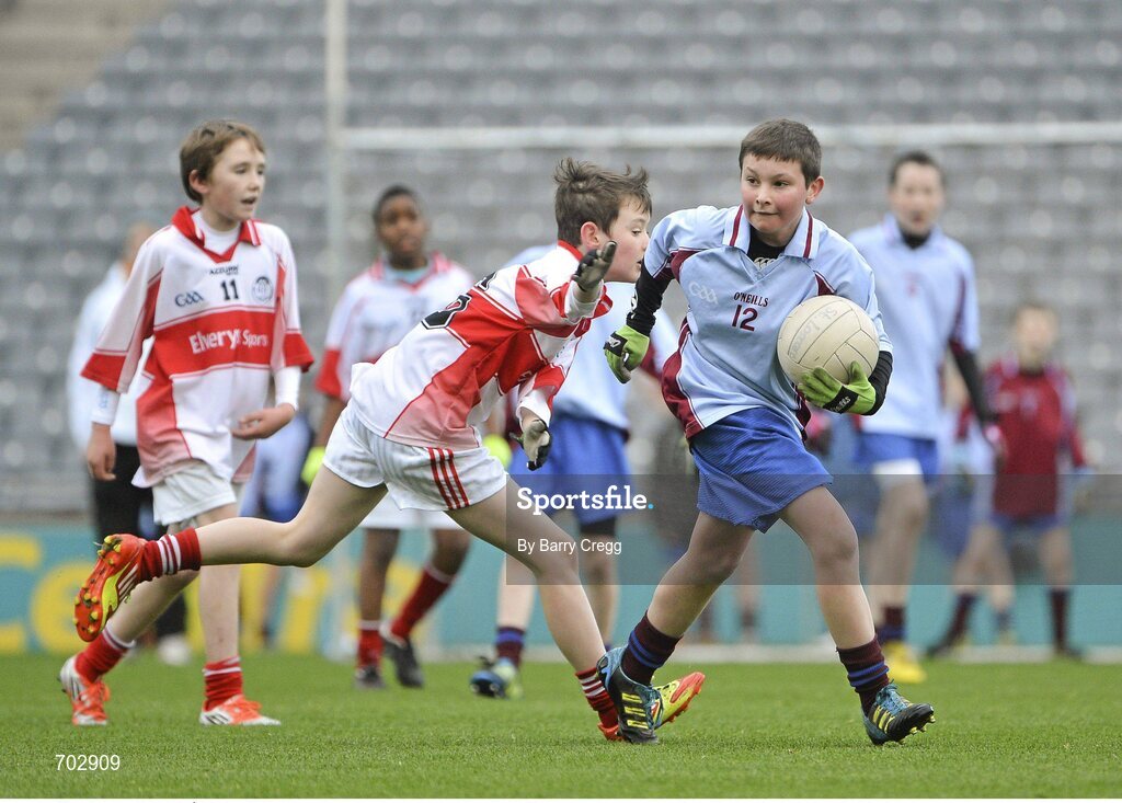 26 November 2012; Niall Ó hAnnáin, Scoil Mobhi Glasanaíon in action against Marc Dietz, Scoil Lorcáin Baile Pámair. Allianz Cumann na mBunscol Finals, Scoil Lorcáin Baile Pámair v Scoil Mobhi Glasanaíon, Croke Park, Dublin. Picture credit: Barry Cregg / SPORTSFILE