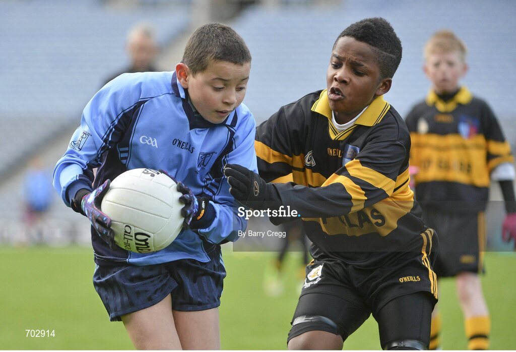 26 November 2012; Azzam Raguragui, Scoil Attracta SNS Ballinteer, in action against Daniel Soyemi, St Mark’s Springfield. Allianz Cumann na mBunscol Finals, St Mark’s Springfield v Scoil Attracta SNS Ballinteer, Croke Park, Dublin. Picture credit: Barry Cregg / SPORTSFILE