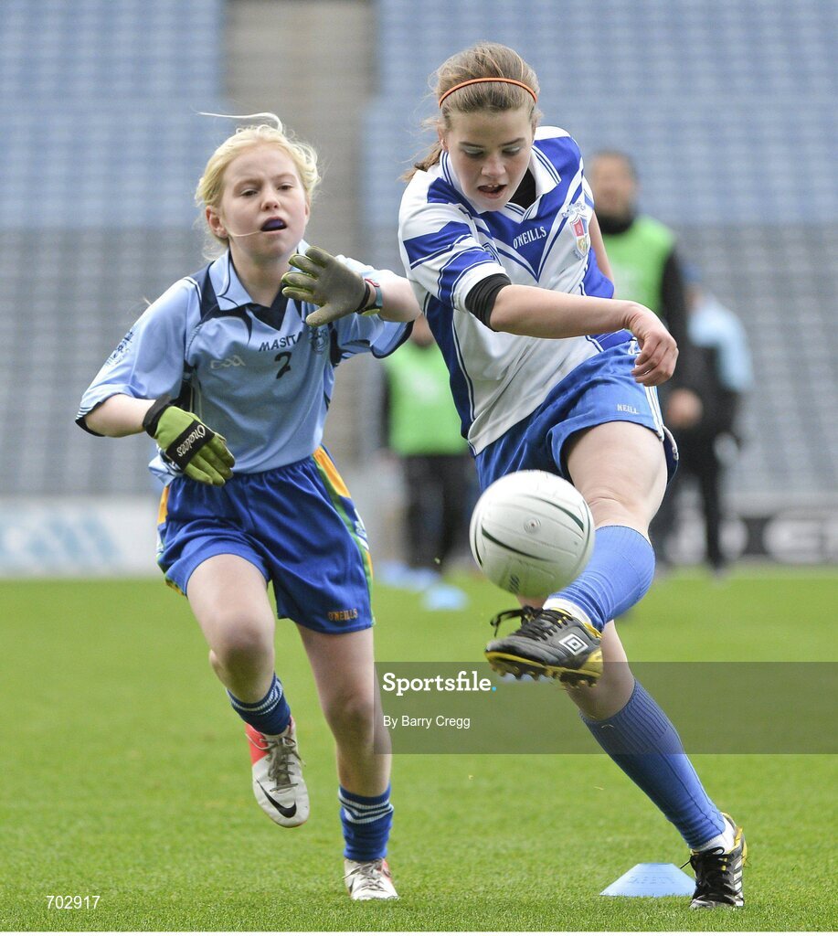 26 November 2012; Emma Nic Gabhann, Gaelscoil Thaobh na Coille, An Chéim, right, in action against Leah Rose McDonagh, Scoil Mhuire, Dumhach Thrá. Allianz Cumann na mBunscol Finals, Gaelscoil Thaobh na Coille v Scoil Mobhi Glasanaíon, Croke Park, Dublin. Picture credit: Barry Cregg / SPORTSFILE
