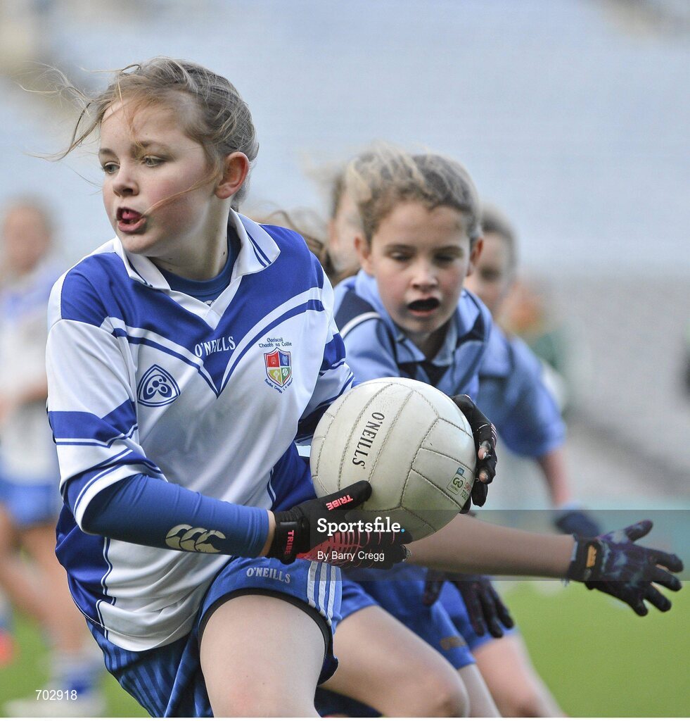 26 November 2012; Nia Ní Chinnéide, Gaelscoil Thaobh na Coille, An Chéim, in action against Ellen O'Byrne, Scoil Mhuire, Dumhach Thrá, right. Allianz Cumann na mBunscol Finals, Gaelscoil Thaobh na Coille v Scoil Mobhi Glasanaíon, Croke Park, Dublin. Picture credit: Barry Cregg / SPORTSFILE