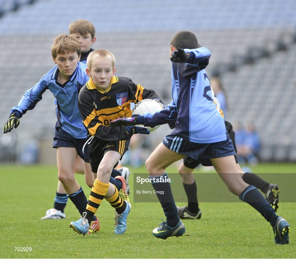 26 November 2012; Gary Kett, St Mark’s Springfield, in action against William O'Shea, left, and Azzam Raguragui, right, Scoil Attracta SNS Ballinteer. Allianz Cumann na mBunscol Finals, St Mark’s Springfield v Scoil Attracta SNS Ballinteer, Croke Park, Dublin. Picture credit: Barry Cregg / SPORTSFILE