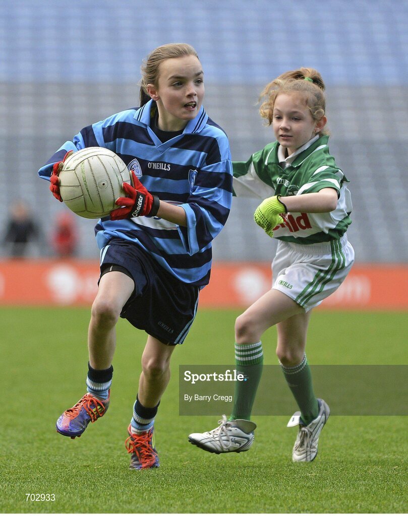 26 November 2012; Rebecca Cooke, St Helen’s Portmarnock, left, in action against Erika O'Reilly Byrne, St Paul’s Ayrfield. Allianz Cumann na mBunscol Finals, St Helen’s Portmarnock v St Paul’s Ayrfield, Croke Park, Dublin. Picture credit: Barry Cregg / SPORTSFILE