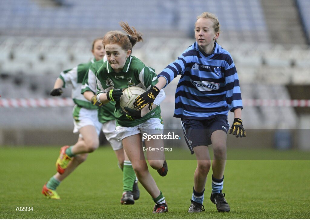 26 November 2012; Katie Flynn, St Paul’s Ayrfield, left, in action against Melissa Kelly, St Helen’s Portmarnock. Allianz Cumann na mBunscol Finals, St Helen’s Portmarnock v St Paul’s Ayrfield, Croke Park, Dublin. Picture credit: Barry Cregg / SPORTSFILE