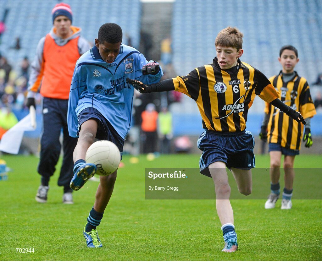 26 November 2012; Mervin Mambo, Scoil Peter & Paul Baldoyle, in action against Daragh Keating, St Helen's Portmarnock. Allianz Cumann na mBunscol Finals, Scoil Peter & Paul Baldoyle v St Helen’s Portmarnock, Croke Park, Dublin. Picture credit: Barry Cregg / SPORTSFILE