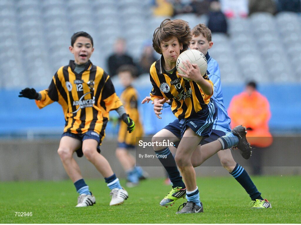 26 November 2012; David Dennehy, St Helen's Portmarnock, left, in action against Rían Finnegan, Scoil Peter & Paul Baldoyle, right. Allianz Cumann na mBunscol Finals, Scoil Peter & Paul Baldoyle v St Helen’s Portmarnock, Croke Park, Dublin. Picture credit: Barry Cregg / SPORTSFILE