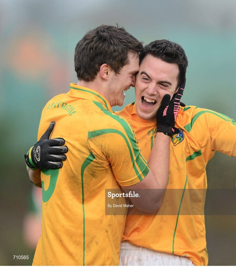 13 January 2013; Paddy McGowan, left, celebrates with Colm Clarke, Leitrim, at the end of the game. Connacht FBD League Section B, Leitrim v Mayo, Páirc Seán O'Heslin, Ballinamore, Co. Leitrim. Picture credit: David Maher / SPORTSFILE