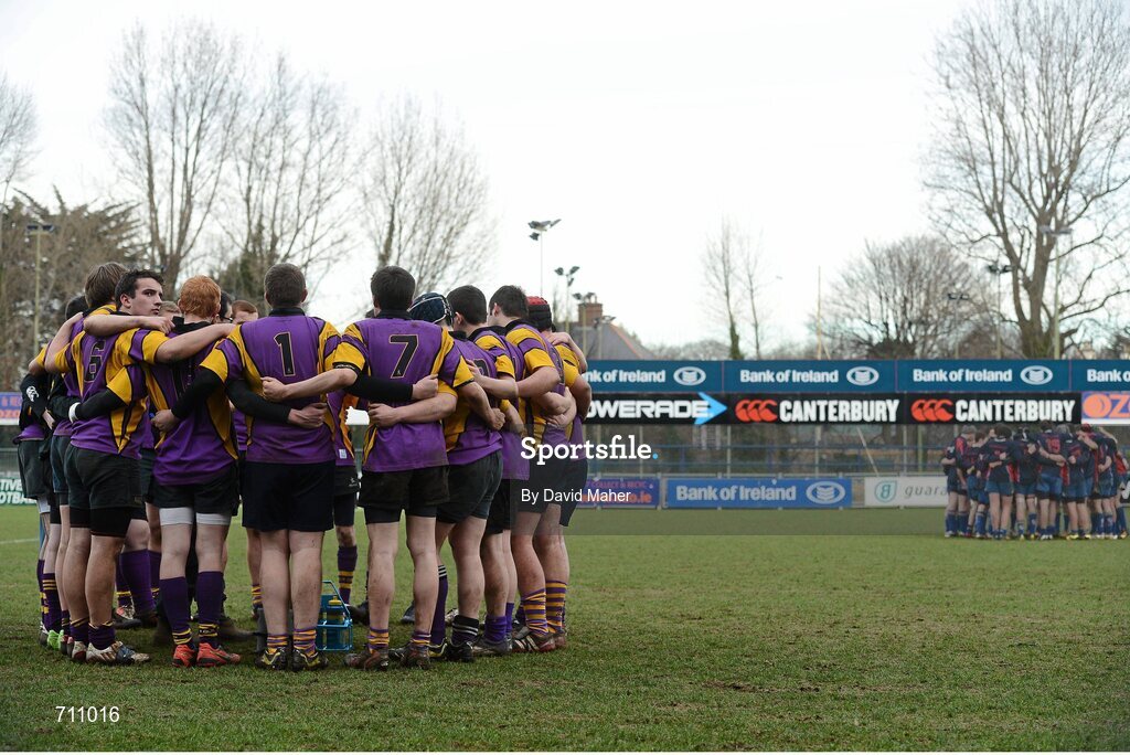 15 January 2013; The CBS Wexford players form a huddle opposite the Ratoath C.C players at half-time. Senior Development Cup Final, CBS Wexford v Ratoath C.C, Donnybrook Stadium, Donnybrook, Dublin. Picture credit: David Maher / SPORTSFILE