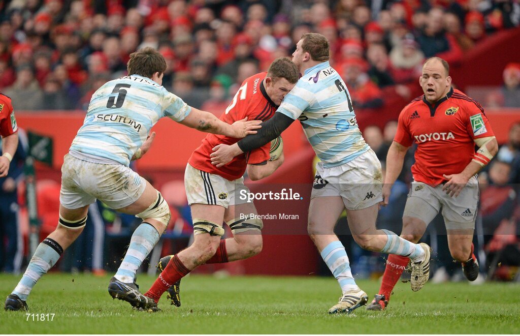 20 January 2013; Donnacha Ryan, Munster, is tackled by Fabrice Metz, left, and Benjamin Noirot, Racing Metro 92. Heineken Cup, Pool 1, Round 6, Munster v Racing Metro 92, Thomond Park, Limerick. Picture credit: Brendan Moran / SPORTSFILE