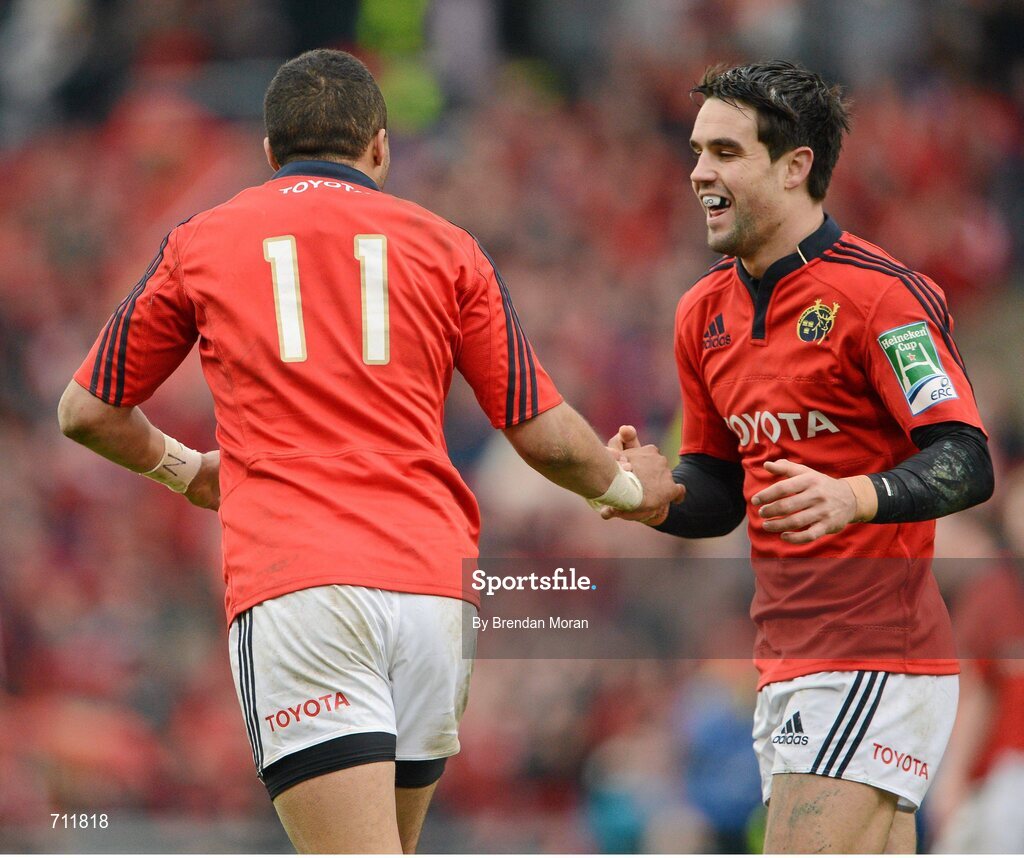 20 January 2013; Simon Zebo, Munster, is congratulated by team-mate Conor Murray after scoring their side's fourth try. Heineken Cup, Pool 1, Round 6, Munster v Racing Metro 92, Thomond Park, Limerick. Picture credit: Brendan Moran / SPORTSFILE