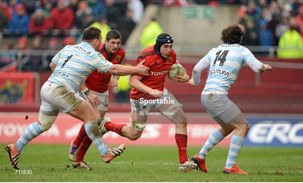 20 January 2013; Tommy O'Connell, Munster, is tackled by Julien Brugnaut, Racing Metro 92. Heineken Cup, Pool 1, Round 6, Munster v Racing Metro 92, Thomond Park, Limerick. Picture credit: Brendan Moran / SPORTSFILE
