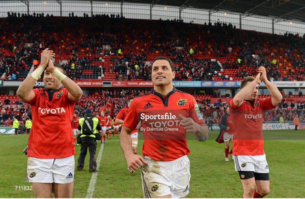 20 January 2013; Munster's Simon Zebo, left, Doug Howlett, centre, and JJ Hanrahan applaud supporters after the game. Heineken Cup, Pool 1, Round 6, Munster v Racing Metro 92, Thomond Park, Limerick. Picture credit: Diarmuid Greene / SPORTSFILE