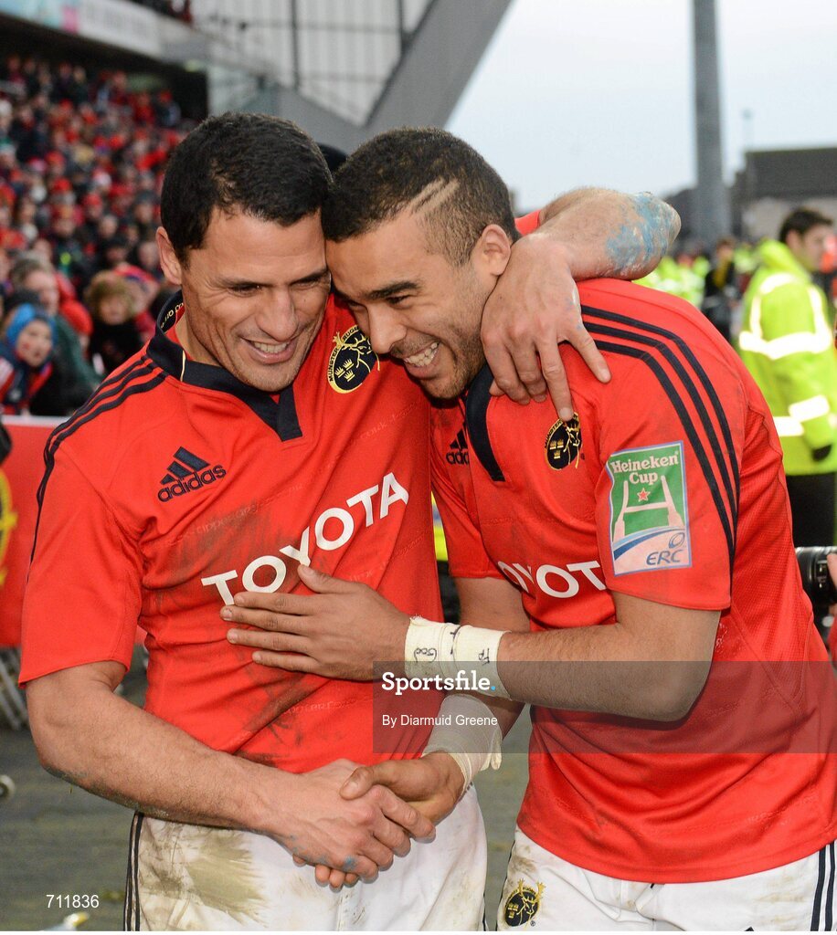 20 January 2013; Munster's Doug Howlett, left, and Simon Zebo celebrate after the game. Heineken Cup, Pool 1, Round 6, Munster v Racing Metro 92, Thomond Park, Limerick. Picture credit: Diarmuid Greene / SPORTSFILE