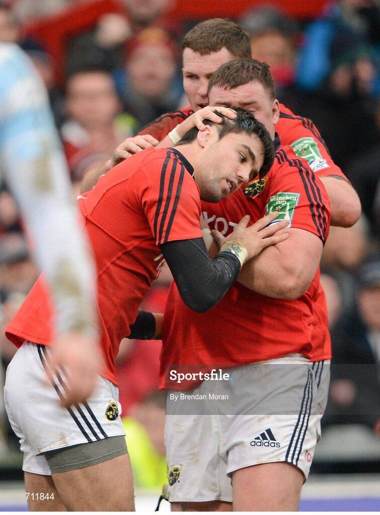 20 January 2013; Conor Murray, Munster, is congratulated on scoring his side's first try by team-mate Dave Kilcoyne. Heineken Cup, Pool 1, Round 6, Munster v Racing Metro 92, Thomond Park, Limerick. Picture credit: Brendan Moran / SPORTSFILE