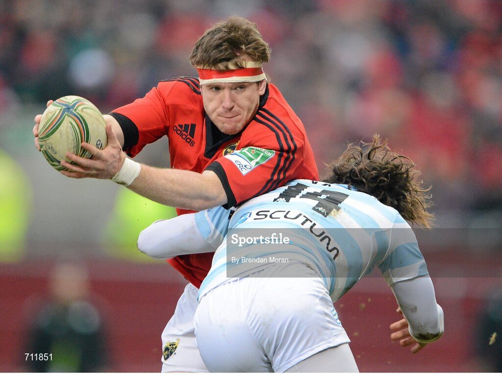 20 January 2013; Mike Sherry, Munster, attempts to offload under pressure from Julien Jane, Racing Metro 92. Heineken Cup, Pool 1, Round 6, Munster v Racing Metro 92, Thomond Park, Limerick. Picture credit: Brendan Moran / SPORTSFILE