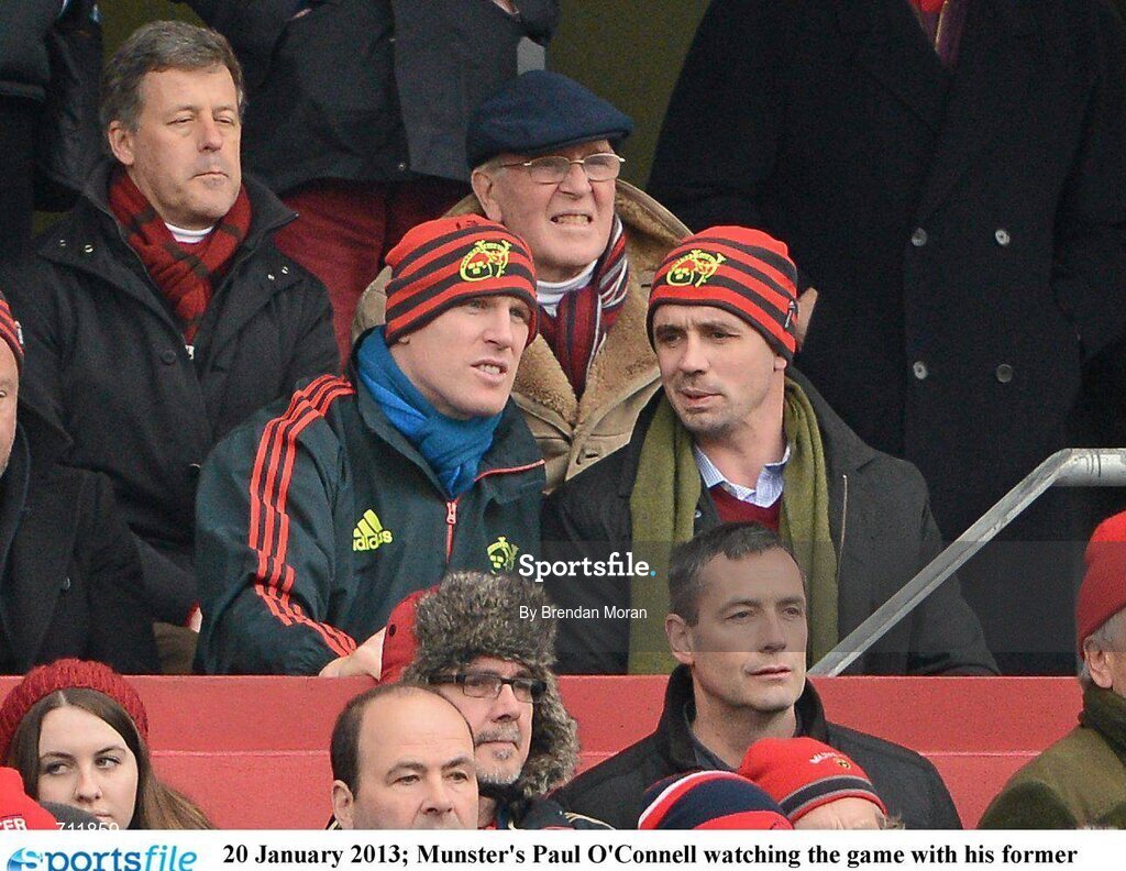 20 January 2013; Munster's Paul O'Connell watching the game with his former team-mate Alan Quinlan. Heineken Cup, Pool 1, Round 6, Munster v Racing Metro 92, Thomond Park, Limerick. Picture credit: Brendan Moran / SPORTSFILE
