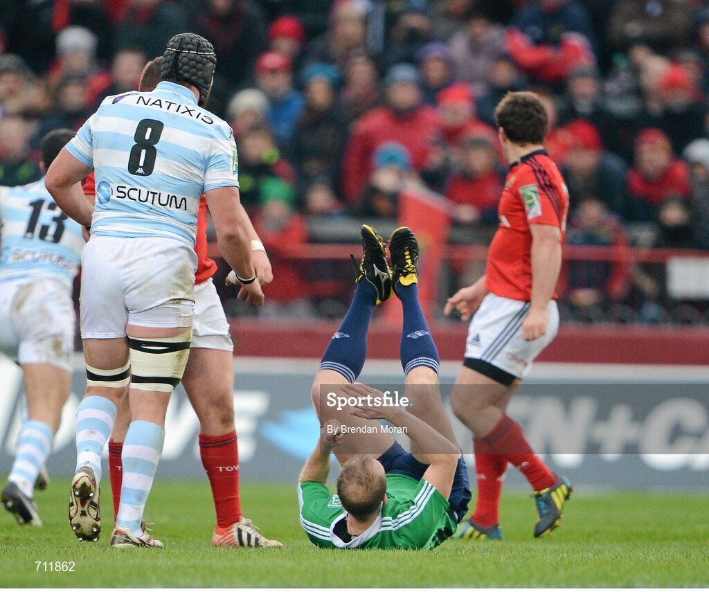 20 January 2013; Referee Wayne Barnes falls to the ground after being struck in the head with the ball. Heineken Cup, Pool 1, Round 6, Munster v Racing Metro 92, Thomond Park, Limerick. Picture credit: Brendan Moran / SPORTSFILE