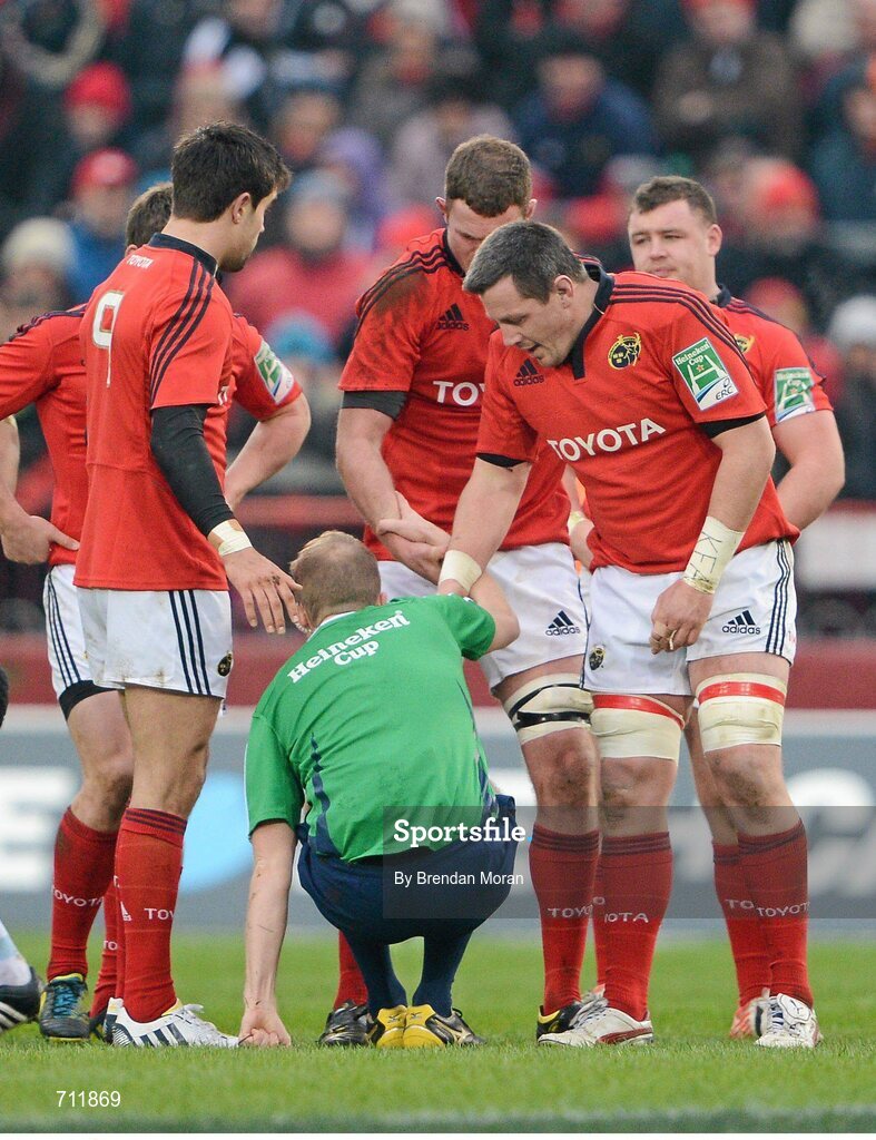 20 January 2013; Referee Wayne Barnes is helped yo his feet by Munster's James Coughlan after being struck in the head with the ball. Heineken Cup, Pool 1, Round 6, Munster v Racing Metro 92, Thomond Park, Limerick. Picture credit: Brendan Moran / SPORTSFILE