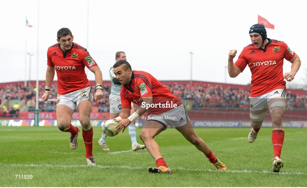 20 January 2013; Simon Zebo, Munster, supported by team-mates James Downey, left, and Tommy O'Donnell, scores his first and their side's 2nd try against Racing Metro 92. Heineken Cup, Pool 1, Round 6, Munster v Racing Metro 92, Thomond Park, Limerick. Picture credit: Brendan Moran / SPORTSFILE