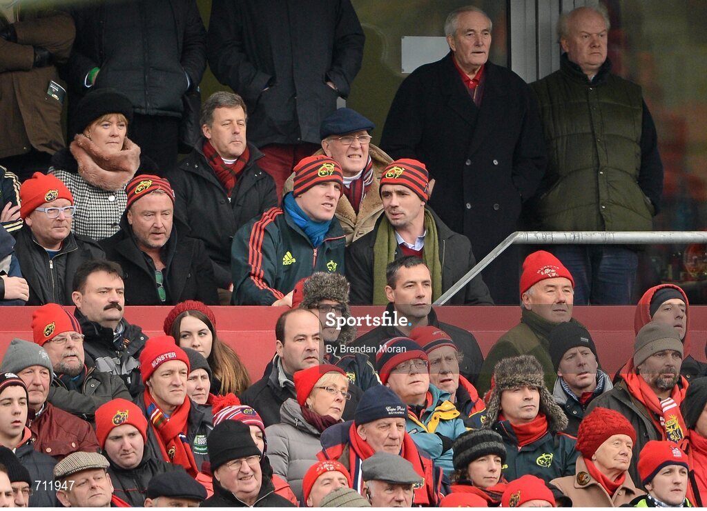20 January 2013; Munster's Paul O'Connell watching the game with his former team-mate Alan Quinlan. Heineken Cup, Pool 1, Round 6, Munster v Racing Metro 92, Thomond Park, Limerick. Picture credit: Brendan Moran / SPORTSFILE