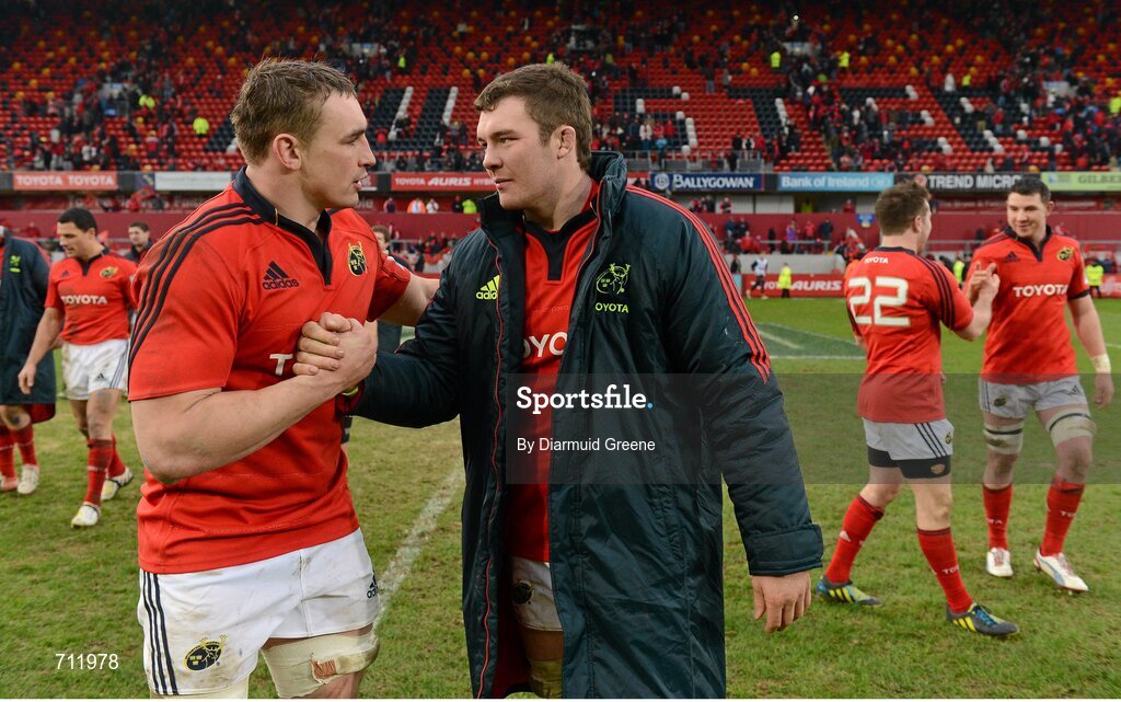 20 January 2013; Munster's Tommy O'Donnell, left, and Peter O'Mahony exchange a handshake after the game. Heineken Cup, Pool 1, Round 6, Munster v Racing Metro 92, Thomond Park, Limerick. Picture credit: Diarmuid Greene / SPORTSFILE