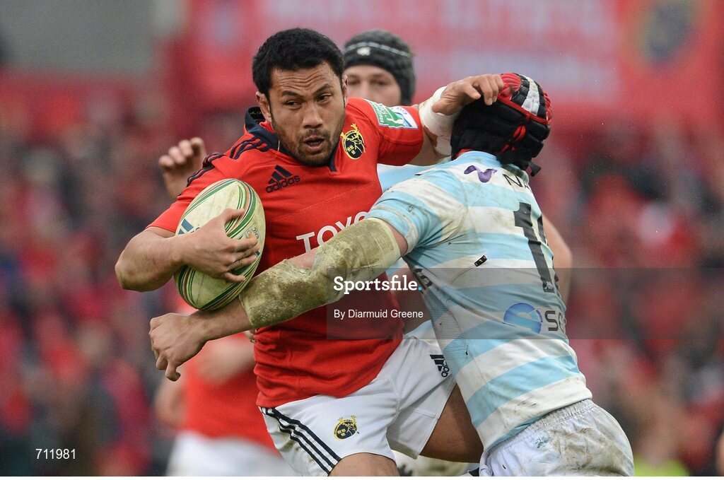 20 January 2013; Casey Laulala, Munster, is tackled by Alexandre Dumoulin, Racing Metro 92. Heineken Cup, Pool 1, Round 6, Munster v Racing Metro 92, Thomond Park, Limerick. Picture credit: Diarmuid Greene / SPORTSFILE