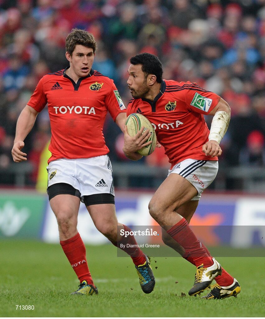 20 January 2013; Munster's Casey Laulala supported by Ian Keatley. Heineken Cup, Pool 1, Round 6, Munster v Racing Metro 92, Thomond Park, Limerick. Picture credit: Diarmuid Greene / SPORTSFILE