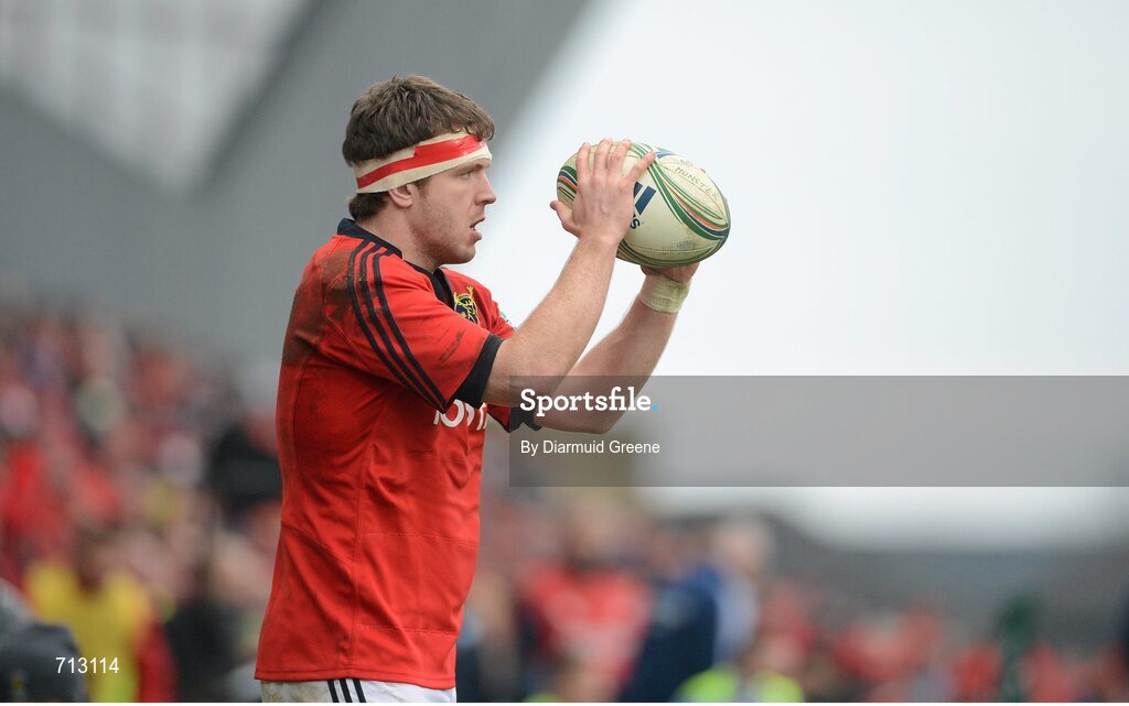 20 January 2013; Munster's Mike Sherry prepares to throw into a lineout. Heineken Cup, Pool 1, Round 6, Munster v Racing Metro 92, Thomond Park, Limerick. Picture credit: Diarmuid Greene / SPORTSFILE