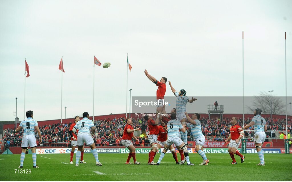 20 January 2013; Donnacha Ryan, Munster, wins possession in a lineout ahead of Karim Ghezal, Racing Metro 92. Heineken Cup, Pool 1, Round 6, Munster v Racing Metro 92, Thomond Park, Limerick. Picture credit: Diarmuid Greene / SPORTSFILE
