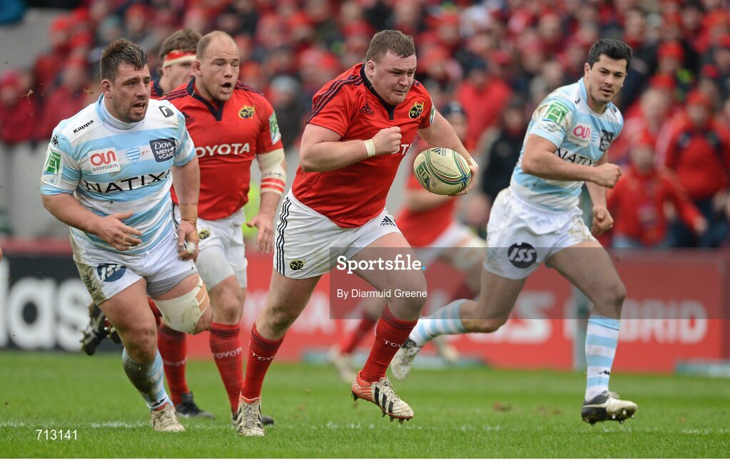 20 January 2013; Dave Kilcoyne, Munster, in action against Julien Brugnaut, left, and Guillaume Bousses, Racing Metro 92. Heineken Cup, Pool 1, Round 6, Munster v Racing Metro 92, Thomond Park, Limerick. Picture credit: Diarmuid Greene / SPORTSFILE