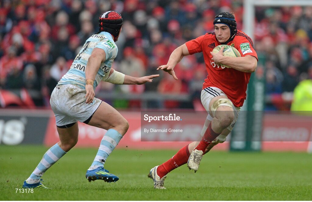 20 January 2013; Tommy O'Donnell, Munster, in action against Alexandre Dumoulin, Racing Metro 92. Heineken Cup, Pool 1, Round 6, Munster v Racing Metro 92, Thomond Park, Limerick. Picture credit: Diarmuid Greene / SPORTSFILE