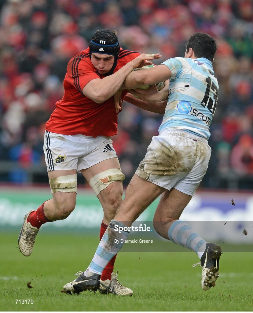 20 January 2013; Tommy O'Donnell, Munster, in action against Guillaume Bousses, Racing Metro 92. Heineken Cup, Pool 1, Round 6, Munster v Racing Metro 92, Thomond Park, Limerick. Picture credit: Diarmuid Greene / SPORTSFILE