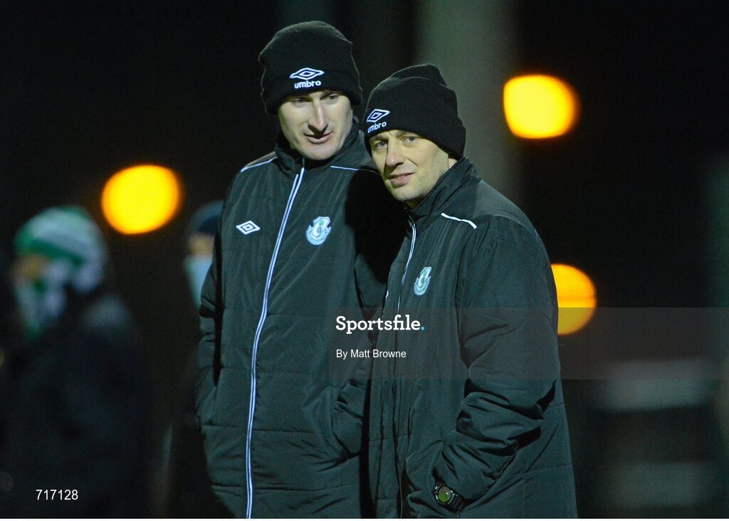 1 February 2013; Trevor Croly, right, Shamrock Rovers manager, with Colin Hawkins, Shamrock Rovers assistant manager. Pre-Season Friendly, Wexford Youths v Shamrock Rovers, the Sportsgrounds, Carlow IT, Carlow. Picture credit: Matt Browne / SPORTSFILE