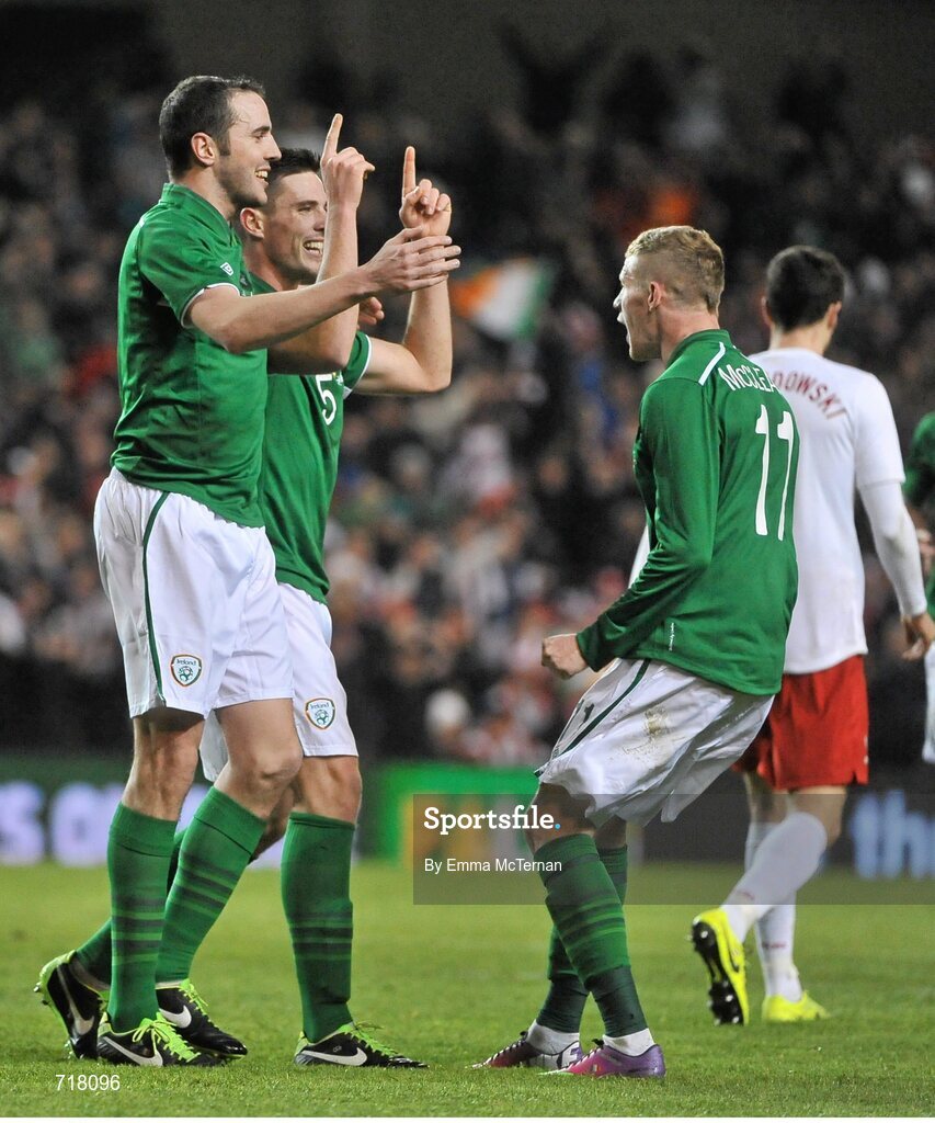 6 February 2013; Ciaran Clark, Republic of Ireland, celebrates with team-mates John O'Shea, left, and James McClean after scoring their side's first goal. International Friendly, Republic of Ireland v Poland, Aviva Stadium, Lansdowne Road, Dublin. Picture credit: Emma McTernan / SPORTSFILE