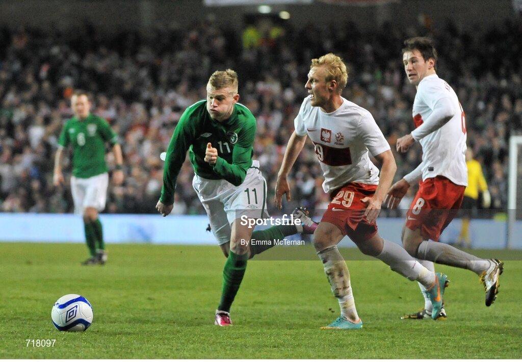 6 February 2013; James McClean, Republic of Ireland, in action against Daniel Lukasik, Poland. International Friendly, Republic of Ireland v Poland, Aviva Stadium, Lansdowne Road, Dublin. Picture credit: Emma McTernan / SPORTSFILE