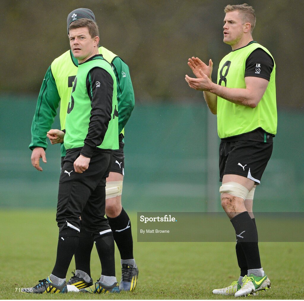 8 February 2013; Ireland's Brian O'Driscoll, left, and Jamie Heaslip during squad training ahead of their RBS Six Nations Rugby Championship match against England on Sunday. Ireland Rugby Squad Training, Carton House, Maynooth, Co. Kildare. Picture credit: Matt Browne / SPORTSFILE