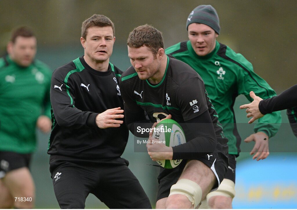 8 February 2013; Ireland's Donnacha Ryan and Brian O'Driscoll, left, in action during squad training ahead of their RBS Six Nations Rugby Championship match against England on Sunday. Ireland Rugby Squad Training, Carton House, Maynooth, Co. Kildare. Picture credit: Matt Browne / SPORTSFILE