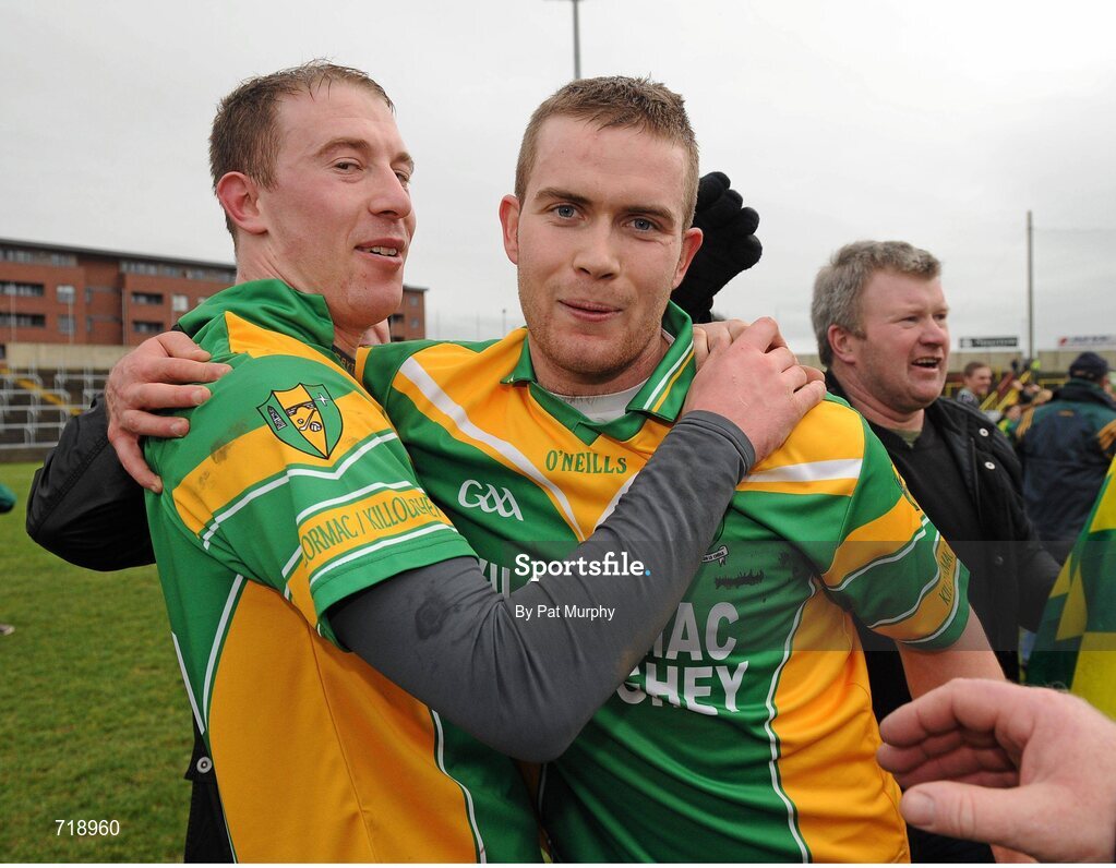 9 February 2013; Kilcormac - Killoughey's Dan Currans, left, and Damien Kilmartin celebrate after the game. AIB GAA Hurling All-Ireland Senior Club Championship Semi-Final, Thurles Sarsfields, Tipperary v Kilcormac - Killoughey, Offaly, O'Moore Park, Portlaoise, Co. Laois. Picture credit: Pat Murphy / SPORTSFILE