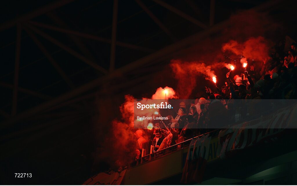 6 February 2013; Poland supporters with flares during the game. International Friendly, Republic of Ireland v Poland, Aviva Stadium, Lansdowne Road, Dublin. Picture credit: Brian Lawless / SPORTSFILE