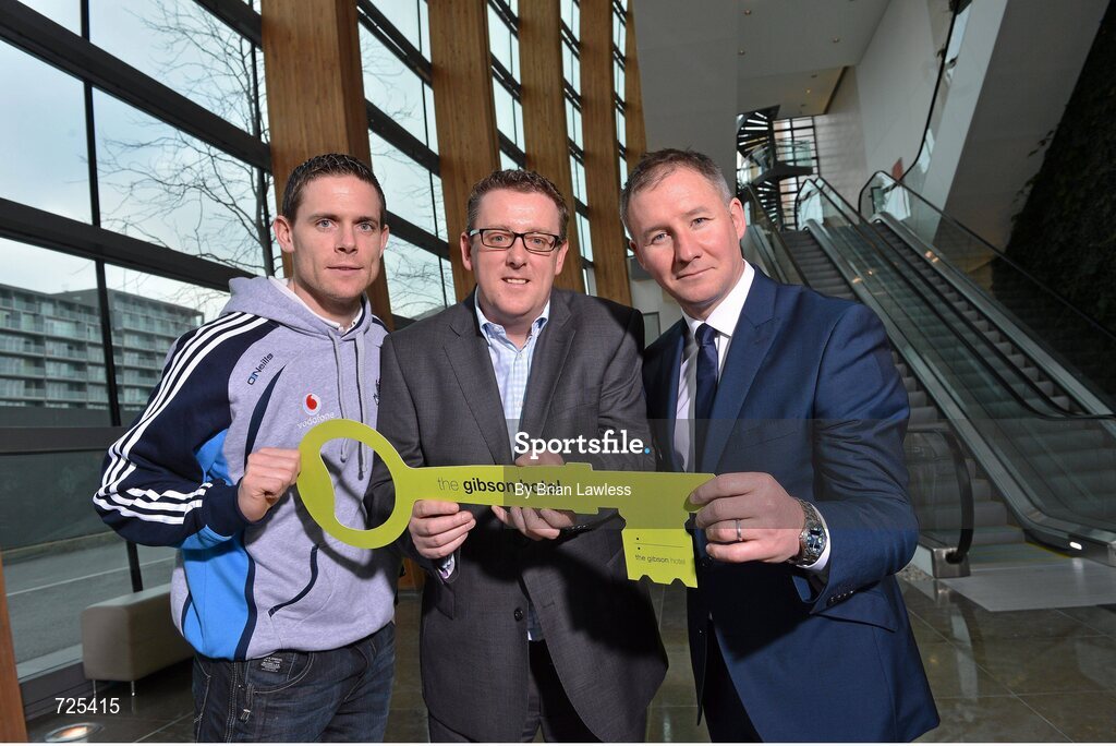 28 February 2013; The Gibson Hotel has been named as the hotel of choice for the Dublin senior football team. At the announcement of the partnership are, Adrian McLaughlin, General Manager, The Gibson Hotel, centre, with Dublin football manager Jim Gavin, and Dublin goalkeeper Stephen Cluxton, left. The Gibson Hotel, Point Village, Dublin. Picture credit: Brian Lawless / SPORTSFILE