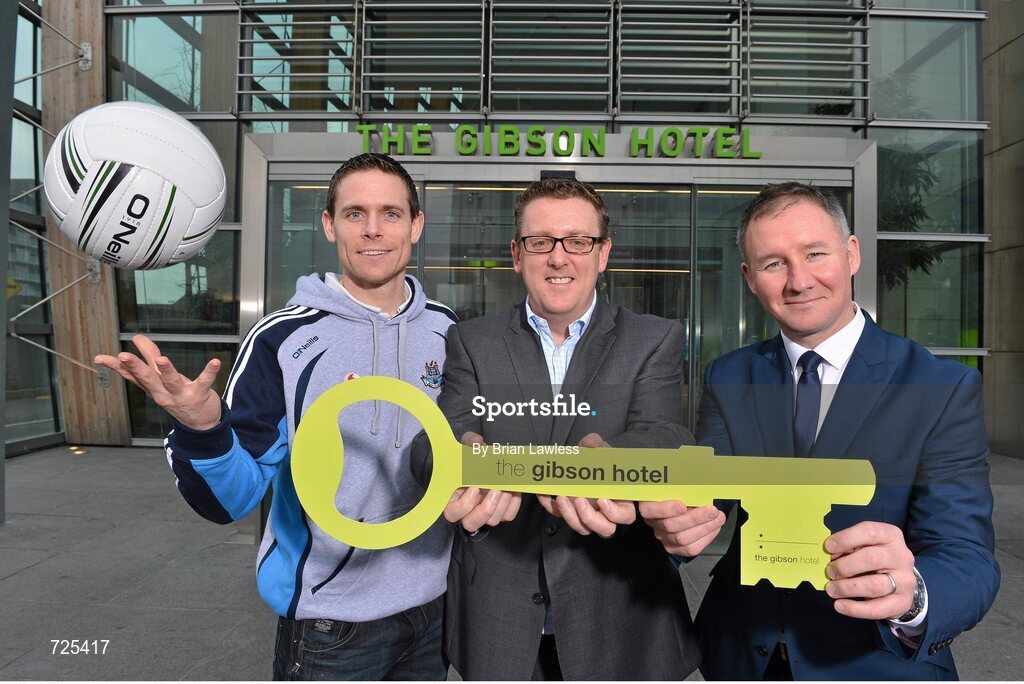 28 February 2013; The Gibson Hotel has been named as the hotel of choice for the Dublin senior football team. At the announcement of the partnership are, Adrian McLaughlin, General Manager, The Gibson Hotel, centre, with Dublin football manager Jim Gavin, and Dublin goalkeeper Stephen Cluxton, left. The Gibson Hotel, Point Village, Dublin. Picture credit: Brian Lawless / SPORTSFILE