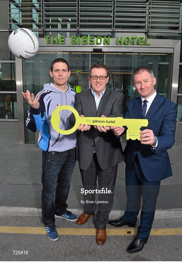 28 February 2013; The Gibson Hotel has been named as the hotel of choice for the Dublin senior football team. At the announcement of the partnership are, Adrian McLaughlin, General Manager, The Gibson Hotel, centre, with Dublin football manager Jim Gavin, and Dublin goalkeeper Stephen Cluxton, left. The Gibson Hotel, Point Village, Dublin. Picture credit: Brian Lawless / SPORTSFILE